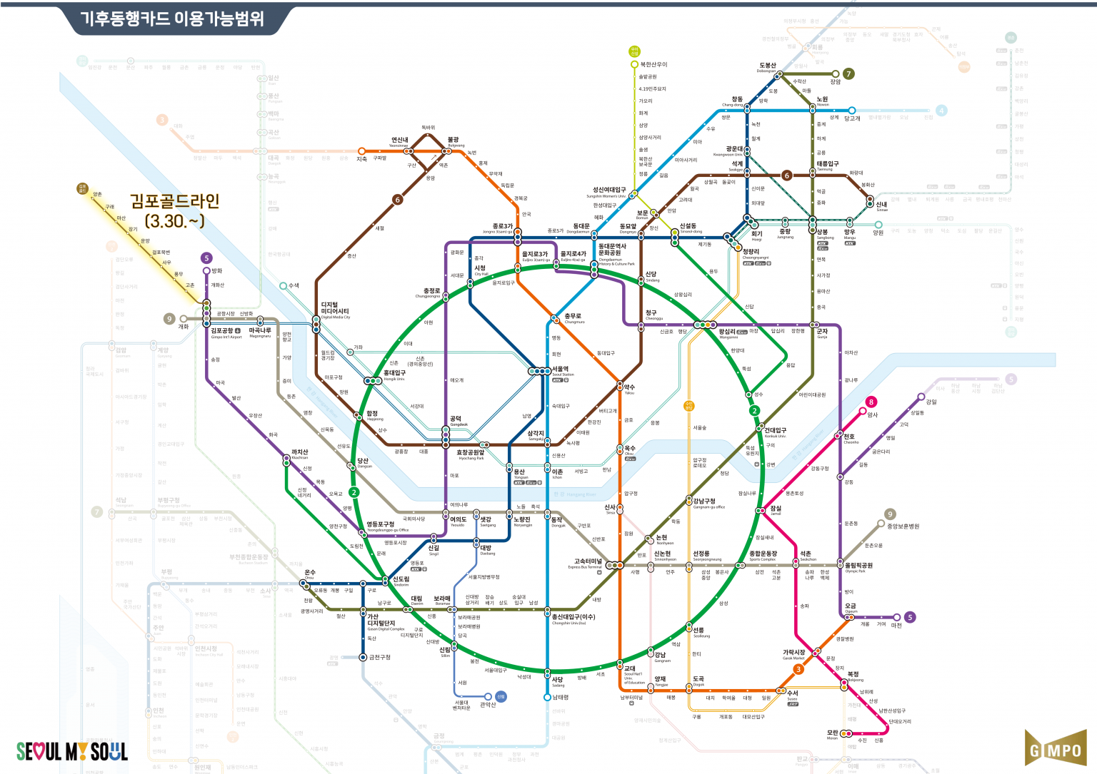 | 지하철 세부노선 | (1호선) 옥수/금천구청~도봉산 (2호선) 지축~오금 (5호선) 방화~강일/마천 (7호선) 온수~장암 (9호선) 전구간 (신림선) 전구간 (경의중앙선) 수색~양원/서울역 (수인분당선) 청량리~복정 |