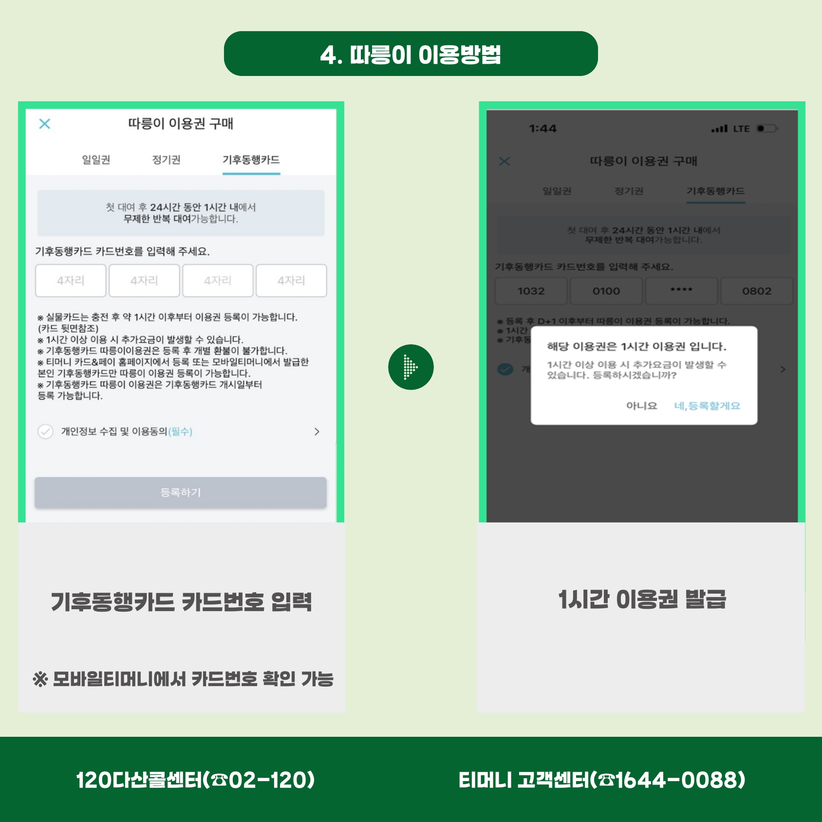 ※ 실물카드는 '티머니 카드&페이' 홈페이지에 사전 등록하지 않으면 따릉이를 이용할 수 없으며, 실물 카드 충전 1시간 후 '티머니GO'앱에서 카드번호 연동사용가능