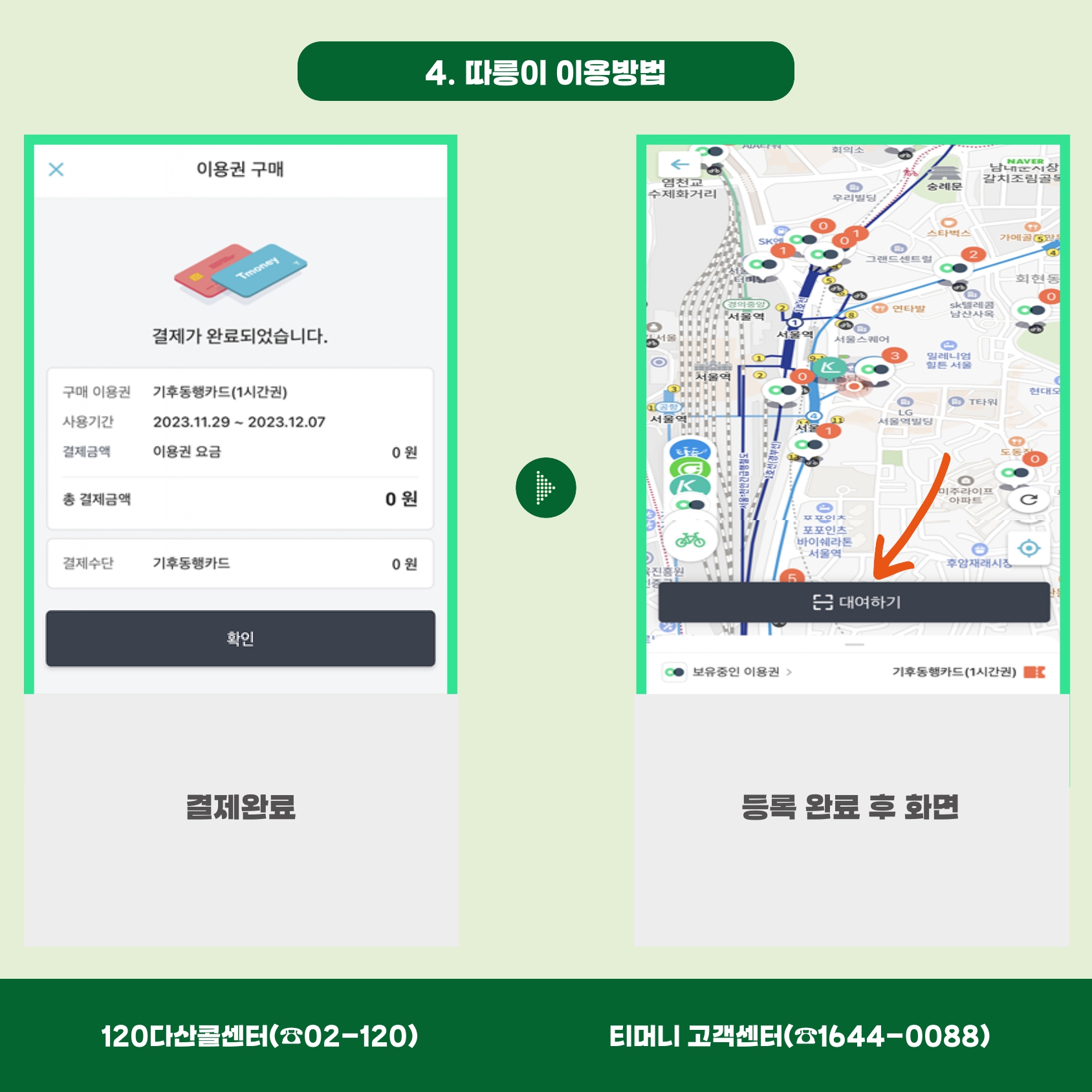 절차 ![]() 결제 현금 결제 서울 교통공사 1호선 서울역 ~ 청량리 구간, 2~8호선 고객실 카드결제 가능 9호선,우이신설선,신림선 등 역사 인근 편의점 *실물카드는 3,000원의 최초 구매 금액 추가 결제됨. 무인충전기 1호선 (서울역~청량리역) 2~9호선 우이신설선 신림선 역사 내 충전기 주의사항 *실물카드 이용자는 반드시 '티머니 카드&페이' 홈페이지에 카드등록 필요 *카드 미등록 시 환불 및 따릉이 이용 불가 ※1인1카드원칙 카드뒷면의 큐알 혹은 밑에 큐알을 찍어 실물카드 등록 ![]() |