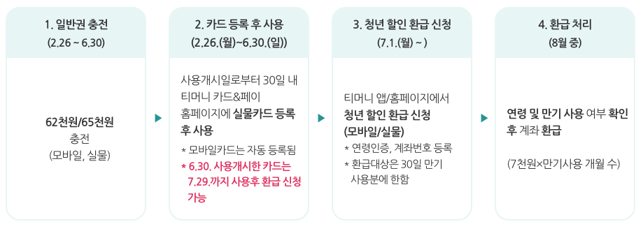 | 일반권(6만 2천원, 6만 5천원)을 충전하여 사용하되, 2.26.(월)~6.30.(일) 중 사용개시한 건에 대해서는 7월 이후 별도 신청을 통해 사후 환급(월 7천원, 최대 3만 5천원) ![]() |
