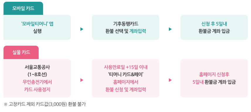 환급금 : 7,000원 X 만기사용 개월 수 ※ 사용 중(30일간) 중도 환불을 받은 경우 만기사용 개월 수에서 제외(환급 불가) 환급을 위한 사전 준비 ·실물카드 : 2.26.(월)부터 사용을 시작한 경우 사용기간(30일) 내에 티머니 카드&페이 홈페이지에 가입하고 카드 등록 필수 *미등록시 환급불가 *모바일카드는 자동 등록됨 *7월 환급 신청 방법은 추후 안내 예정 |